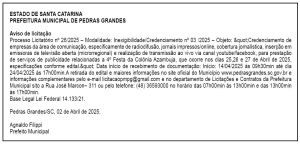 Processo Licitatório nº 26/2025 – Modalidade: Inexigibilidade/Credenciamento nº 03 /2025 – Objeto: "Credenciamento de empresas da área de comunicação, especificamente de radiodifusão, jornais impressos/online, cobertura jornalística, inserção em emissoras de televisão aberta (microrregional) e realização de transmissão ao vivo via canal youtube/facebook, para prestação de serviços de publicidade relacionadas a 4º Festa da Colônia Azambuja, que ocorre nos dias 25,26 e 27 de Abril de 2025, especificações conforme edital." Data início de recebimento de documentação: Início: 14/04/2025 às 09h30min até dia 24/04/2025 às 17h00min.A retirada do edital e maiores informações no site oficial do Município www.pedrasgrandes.sc.gov.br e informações complementares pelo e-mail [email protected] e no departamento de Licitações e Contratos da Prefeitura Municipal sito a Rua José Marcon– 311 ou pelo telefone: (48) 36593000 no horário das 07h00min ás 13h00min e das 13h00min às 17h00min.