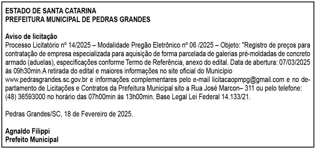 Processo Licitatório nº 14/2025 – Modalidade Pregão Eletrônico nº 06 /2025 – Objeto: “Registro de preços para contratação de empresa especializada para aquisição de forma parcelada de galerias pré-moldadas de concreto armado (aduelas), especificações conforme Termo de Referência, anexo do edital. Data de abertura: 07/03/2025 às 09h30min.A retirada do edital e maiores informações no site oficial do Município www.pedrasgrandes.sc.gov.br e informações complementares pelo e-mail [email protected] e no departamento de Licitações e Contratos da Prefeitura Municipal sito a Rua José Marcon– 311 ou pelo telefone: