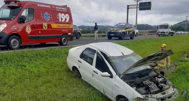 Nesta segunda-feira (30), por volta das 09 horas, os Bombeiros Voluntários de Jaguaruna foram acionados para atender a um acidente de trânsito na BR 101, no KM 358, em Sangão. A colisão envolveu um carro e outro veículo, seguida de uma saída de pista que ocorreu no canteiro central da