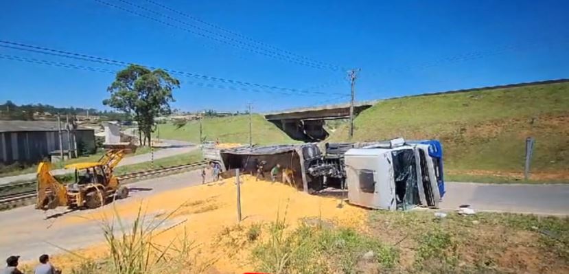 Nesta quinta-feira (05), às 06 horas, carreta carregada de milho tomba perto dos trilhos na localidade de Morro Grande, Sangão. O local do acidente vem sendo pauta de reuniões com a CCR ViaCosteira, pois segundo moradores a empresa realizou mudança nas marginais e deixaram o acesso e retorno por baixo