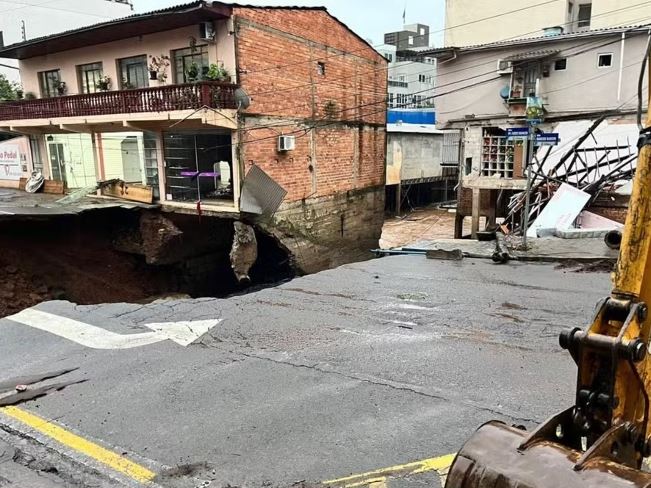 Em Capinzal, a estrutura de uma casa, e onde também funcionava um comércio, foi “engolida” por uma cratera que se abriu na quinta-feira (3). Há risco de novos desabamentos.