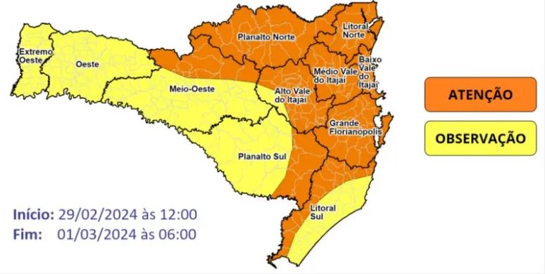 Temporais com maior intensidade devem acontecer em algumas áreas de Santa Catarina entre a tarde e à noite desta quinta-feira, dia 29. No mapa, as regiões em laranja, que são entre a Grande Florianópolis, Vale do Itajaí, Litoral Norte, Planalto Norte e Parte do Meio-Oeste e do Litoral Sul devem ter acumulados que variam entre 50 mm e 70 mm, com pontuais de 100 mm.