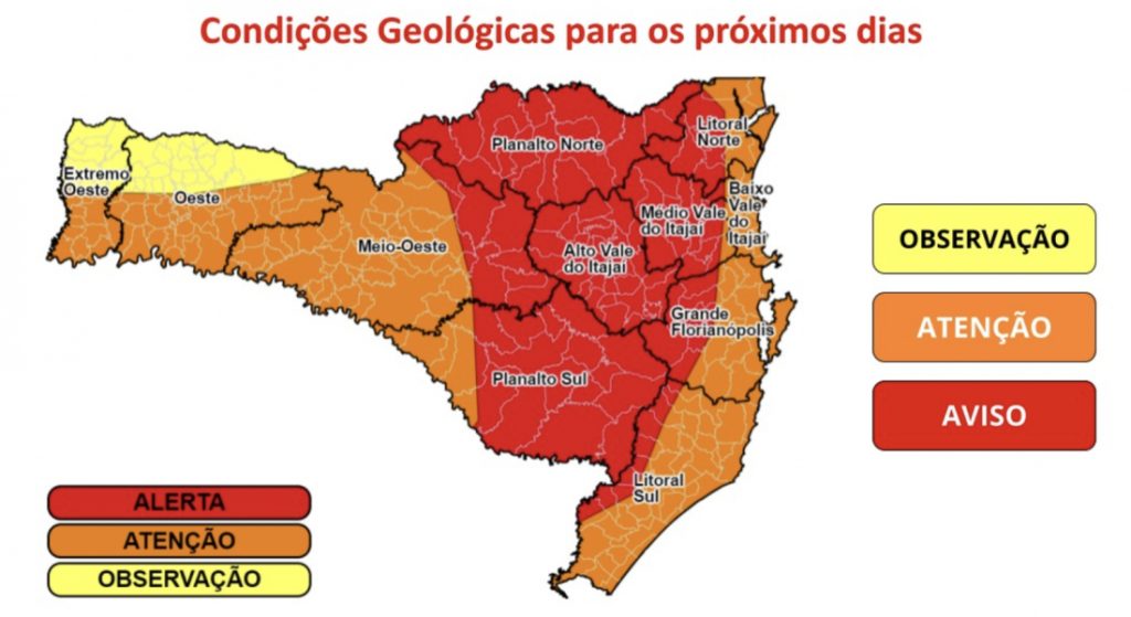 Risco alto para deslizamentos: Regiões do Oeste e Meio-Oeste principalmente áreas em divisa com o Rio Grande do Sul e todo litoral de Santa Catarina e parte da Grande Florianópolis.