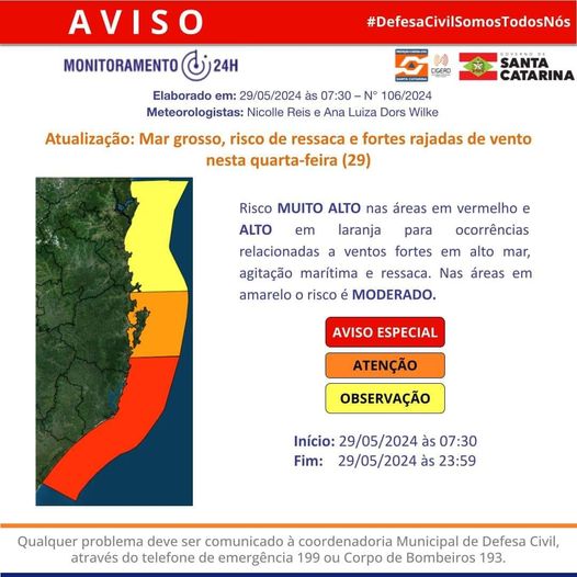 A atuação de um ciclone em alto mar nesta quarta-feira (29) provoca agitação marítima, trazendo condições para mar grosso e ressaca no litoral de Santa Catarina. A Defesa Civil fez um alerta vermelho para alta agitação marítima no Litoral Sul as ondas chegam a 4,5m. Também são esperadas rajadas de vento de até 70 km/h em todo o Estado.