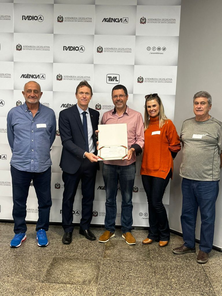 Na tarde desta quarta-feira, dia 31 de maio, o Deputado Estadual Volnei Weber entregou uma moção de aplauso ao ex-atleta e professor Amarildo Gomes pelos relevantes serviços prestados ao voleibol de Santa Catarina.