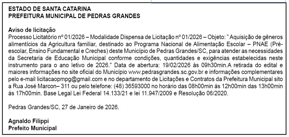 Processo Licitatório nº 01/2026 – Modalidade Dispensa de Licitação nº 01/2026 – Objeto: ” Aquisição de gêneros alimentícios da Agricultura familiar, destinado ao Programa Nacional de Alimentação Escolar – PNAE (Pré-escolar, Ensino Fundamental e Creches) deste Município de Pedras Grandes/SC, para atender as necessidades da Secretaria de Educação Municipal conforme condições, quantidades e exigências estabelecidas neste instrumento para o ano letivo de 2026.” Data de abertura: 19/02/2026 às 09h30min.A retirada do edital e maiores informações no site oficial do Município www.pedrasgrandes.sc.gov.br e informações complementares pelo e-mail [email protected] e no departamento de Licitações e Contratos da Prefeitura Municipal sito a Rua José Marcon– 311 ou pelo telefone: (48) 36593000 no horário das 08h00min ás 12h00min das 13h00min ás 17h00min. Base Legal Lei Federal 14.133/21 e lei 11.947/2009 e Resolução 06/2020.