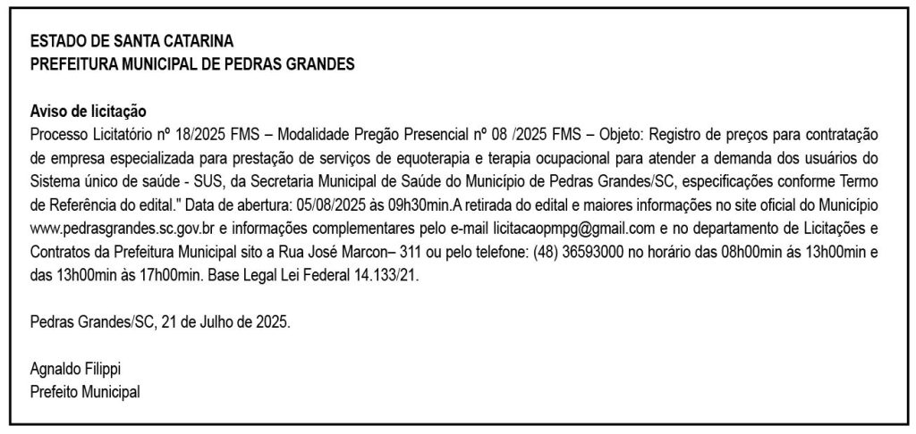 Processo Licitatório nº 18/2025 FMS – Modalidade Pregão Presencial nº 08 /2025 FMS – Objeto: Registro de preços para contratação de empresa especializada para prestação de serviços de equoterapia e terapia ocupacional para atender a demanda dos usuários do Sistema único de saúde – SUS, da Secretaria Municipal de Saúde do Município de Pedras Grandes/SC, especificações conforme Termo de Referência do edital.” Data de abertura: 05/08/2025 às 09h30min.A retirada do edital e maiores informações no site oficial do Município www.pedrasgrandes.sc.gov.br e informações complementares pelo e-mail [email protected] e no departamento de Licitações e Contratos da Prefeitura Municipal sito a Rua José Marcon– 311 ou pelo telefone: (48) 36593000 no horário das 08h00min ás 13h00min e das 13h00min às 17h00min. Base Legal Lei Federal 14.133/21.