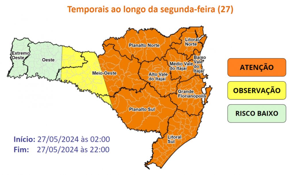 Caso ocorram, devem impactar as áreas mais baixas dos municípios. Para as bacias nas regiões da Grande Florianópolis, Litoral Norte e Litoral Sul, o risco é moderado.