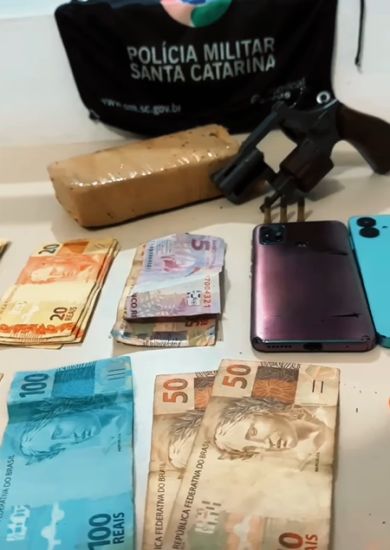 Os policiais apreenderam um revólver calibre .22 com três munições, 429 gramas de maconha, 20 comprimidos de ecstasy e R$ 755 em dinheiro