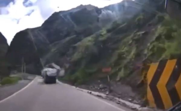 Dois caminhões foram severamente atingidos por um grande deslizamento de pedras que ocorreu no último sábado (2) no quilômetro 97 da Rodovia Central, importante estrada que liga a capital peruana às montanhas. O vídeo registrado pela câmera instalada em um carro viralizou nas redes sociais.