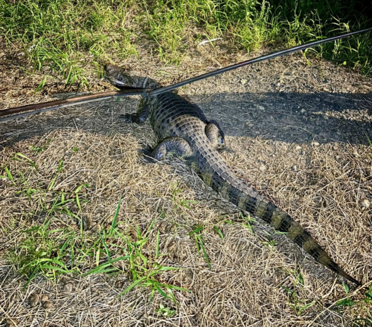 Um jacaré de aproximadamente dois metros foi capturado na noite desta segunda-feira (29) em frente a uma residência, no bairro Humaitá, em Tubarão.