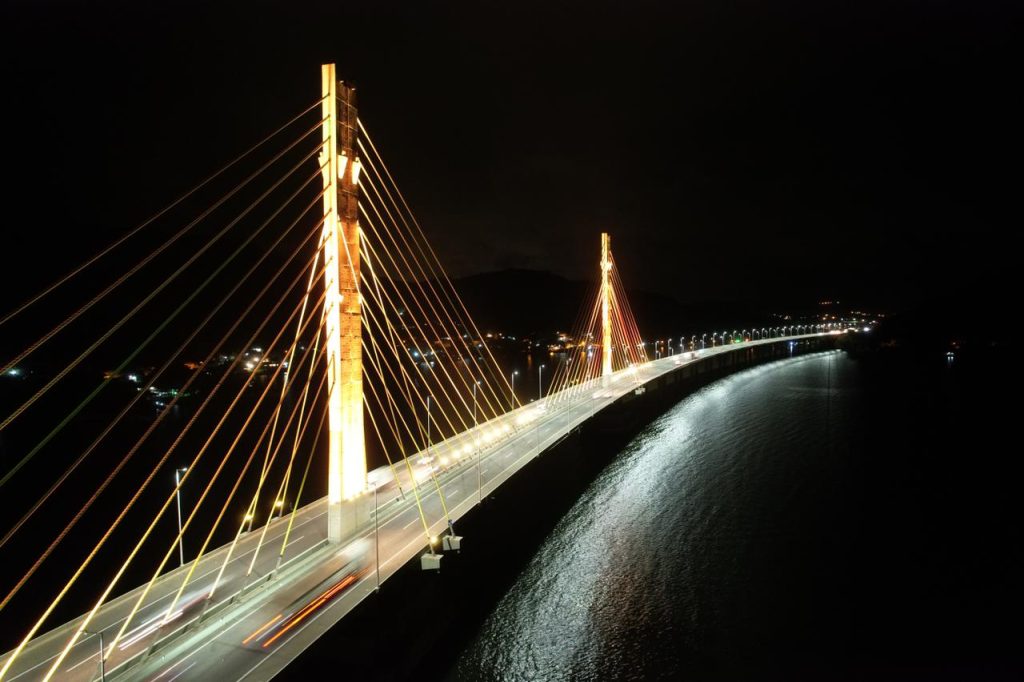 A Ponte Anita Garibaldi está iluminada com luzes amarelas em apoio à Campanha Maio Amarelo, que promove a conscientização sobre a segurança viária. A iluminação cênica amarela permanecerá ativa durante todo o feriado prolongado, incluindo o final de semana, como um símbolo de apoio à causa e para chamar a atenção dos motoristas e pedestres sobre a importância da segurança no trânsito. Durante o mês de maio, a CCR ViaCosteira, em parceria com a Agência Nacional de Transportes Terrestres (ANTT) e a Polícia Rodoviária Federal (PRF), realizou diversas ações educativas e de conscientização em prol da segurança viária. Essas ações incluem campanhas de orientação para motoristas, ciclistas e pedestres, com o objetivo de reduzir acidentes e salvar vidas.