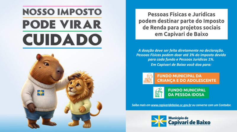 “Nosso imposto pode virar cuidado”. Com esse mote a prefeitura de Capivari de Baixo está promovendo uma campanha de conscientização para que cidadãos e empresas destinem parte do seu Imposto de Renda 2026, a projetos sociais do município, através de dois fundos municipais. A iniciativa reforça que o imposto pago pode se transformar diretamente em cuidado, proteção e oportunidades para crianças, adolescentes e pessoas idosas de Capivari de Baixo.
