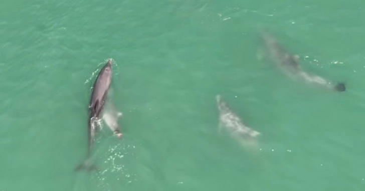 A natureza voltou a chamar atenção neste sábado (18) no Farol de Santa Marta, em Laguna. Um grupo de golfinhos, incluindo um filhote, foi avistado nadando em conjunto e interagindo nas águas próximas à praia.