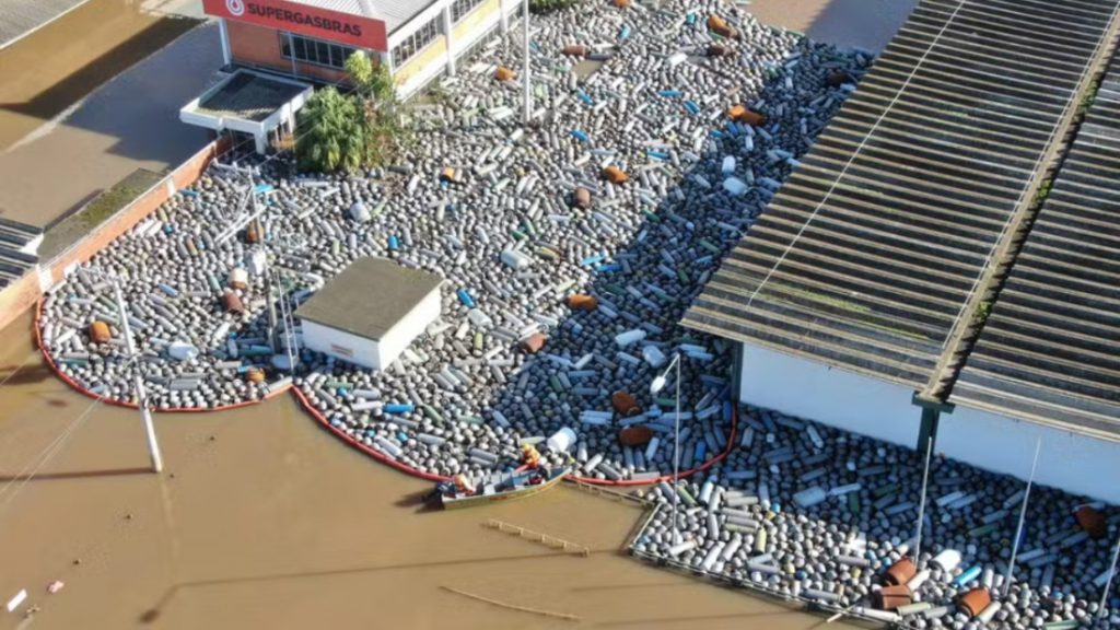 Uma barreira de contenção precisou ser instalada para impedir que a água das cheias carregasse dezenas de botijões de gás de uma distribuidora. A cena foi registrada em Canoas, na região metropolitana de Porto Alegre, uma das cidades mais atingidas pelas enchentes.