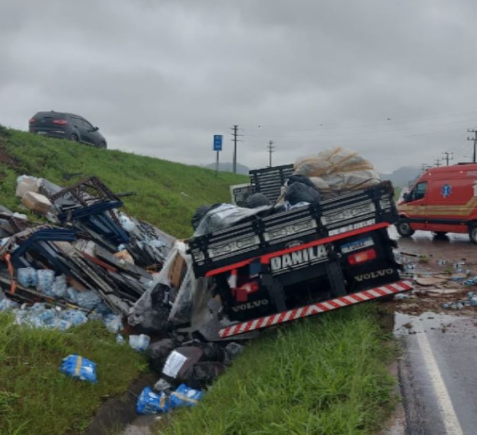 Após os Bombeiros chegar no local foi constatado saída de pisa seguido de capotamento do caminhão Volvo Bitruck 330, placas Mercosul Brasil, conduzido por masculino maior de 29 anos.