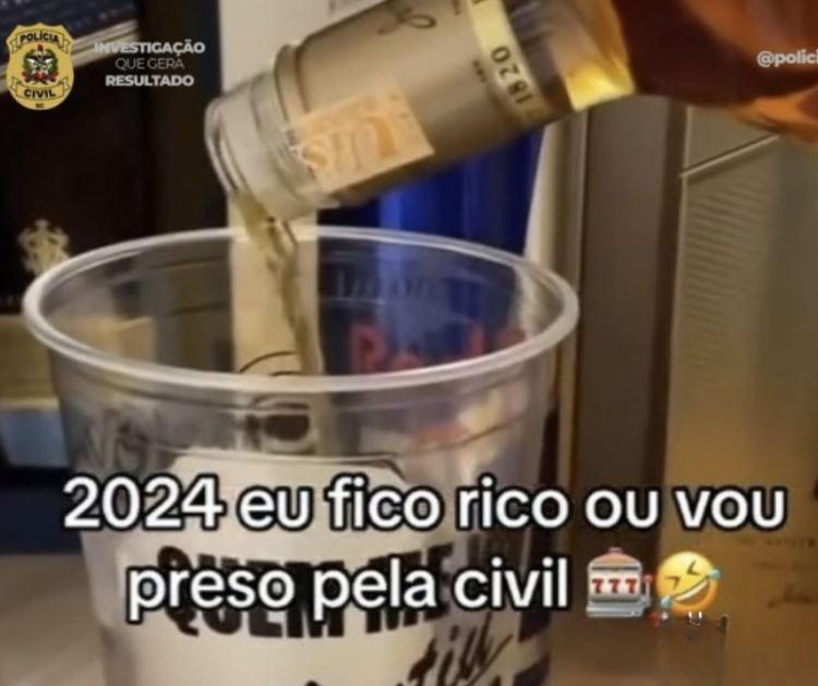 Antes de ser preso, há algum tempo, o suspeito postou nas redes sociais a foto de uma cerveja com a legenda “2024 fico rico ou vou preso pela civil”.