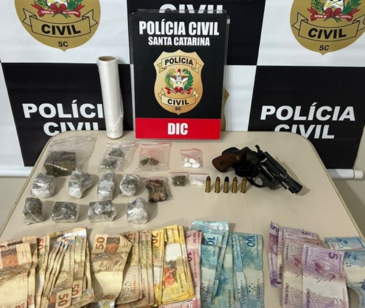 A equipe da DIC solicitou e obteve um mandado de busca e apreensão domiciliar, autorizado pela 1ª Vara Criminal de Tubarão. Durante a operação, foram apreendidas várias porções de maconha, skank e cocaína já preparadas para venda, além de cinco munições e um revólver calibre 38.