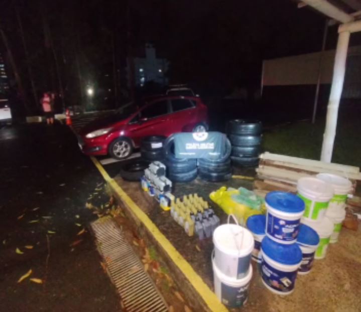 Após abordarem um Ford Fiesta com pneus provenientes do furto, os policiais continuaram na busca pelos demais itens. Com isso, junto aos detidos foram localizados 24 pneus, oito baterias de carro, 24 litros de óleo, 11 cintas de amarração de cargas, 10 luminárias, duas caixas de lâmpadas para as luminárias, nove selador acrílico de 18L e duas massa corrida de 23kg