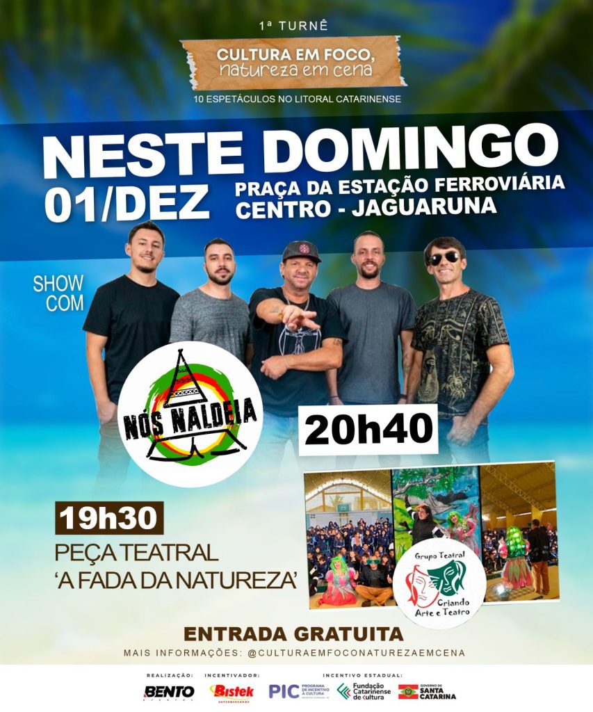 Neste domingo, 1º de dezembro, Jaguaruna recebe a turnê “Cultura em Foco, Natureza em Cena”, um evento cultural e ambiental gratuito que promete encantar o público na Praça da Estação Ferroviária, no centro de Jaguaruna. A programação começa às 19h30, com atividades para toda a família.